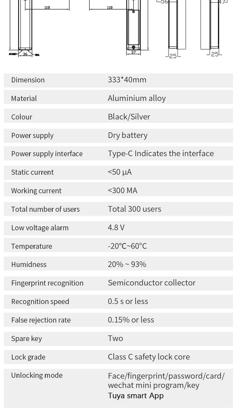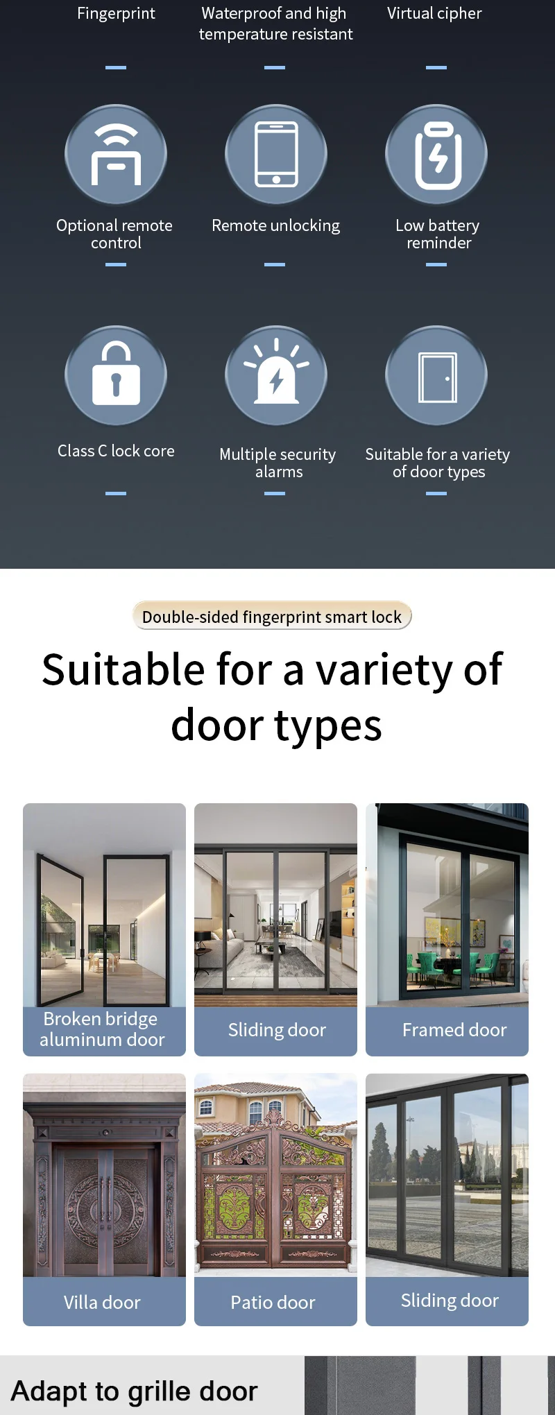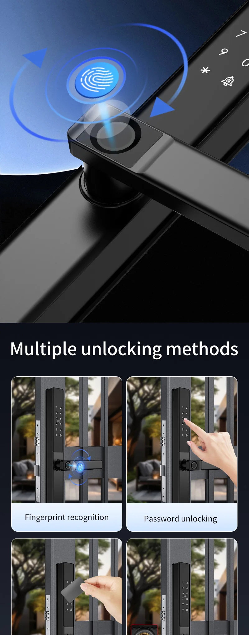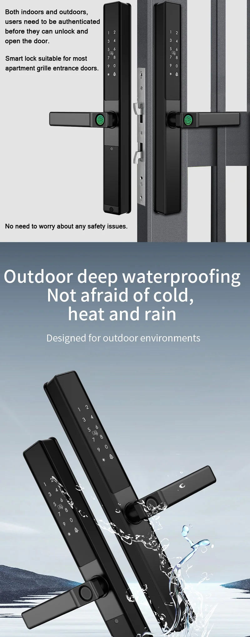 • Dual System Design: Both sides have fingerprints and passwords, both entry and exit require unlock, suitable for grill doors, etc.