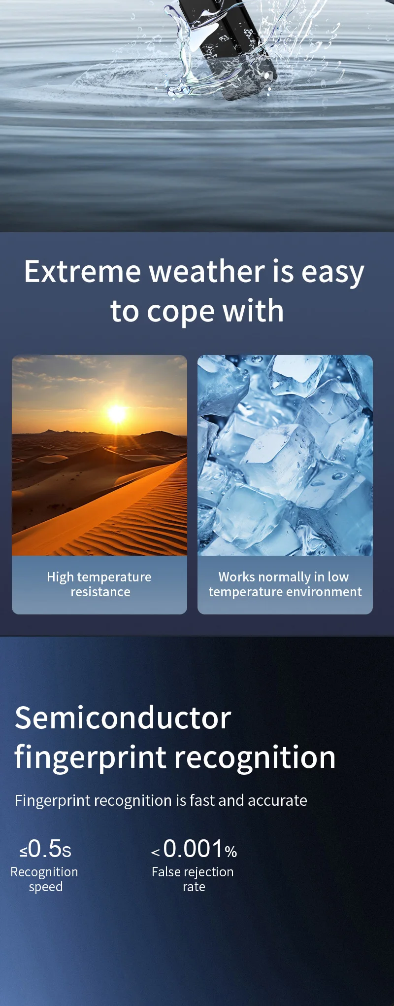 • Multi-modal Unlocking: Supports multiple unlocking methods such as fingerprint, password, key, card, and APP, meeting the needs of different usage scenarios, allowing convenient remote control and maximizing safety performance.